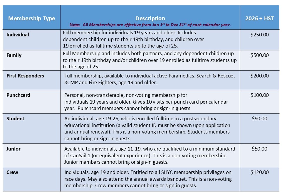 Unlike many other Yacht Clubs, we do not require an initiation fee, nor minimum monthly spending at SHYC. We have several Membership Categories and the fee structure is straight forward and very reasonably priced….perhaps the lowest in the province….and there are no hidden fees. We are a self-help Club and our existence relies on its membership to help in any and every way they can.
